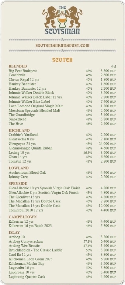 Built into brick and set below street level, The Scotsman is a proper basement bar — warm, relaxed, and made for lingering. In winter, it’s a place to escape the cold; in summer, the thick brick walls keep things cool. It feels familiar, like a good bar in Scotland should. Scottish pubs are friendly, honest places. From the moment you come down the stairs, there’s no pretence — just a warm welcome and a nice place to be. We specialise in Scotch whisky, with an ever-expanding selection, alongside Scottish beers and a range of other spirits and wines. Whether you’re here for a quiet dram, a few drinks with friends, or to watch sports, the atmosphere is easy and unforced. The Scotsman — a small piece of Scotland in the heart of Budapest.